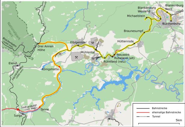 Beginnend in Blankenburg (Höhe über NN 198 m) führt die Strecke ca. 500 m nordwärts. Nach rechts zweigt die Strecke nach Halberstadt ab, während die Rübelandbahn nach links schwenkt. In der Gabelung liegt das Bahnbetriebswerk Blankenburg. Die Strecke passiert in nordwestliche Richtung führend den Güterbahnhof Blankenburg Nord, der 1964 im Rahmen des Ausbaus der Strecke für das Chemieprogramm der DDR errichtet wurde. In einer 180 Grad Linkskurve führt die Strecke um die westliche Stadt und beginnt, stetig an Höhe zu gewinnen. Es folgt eine lange Rechtskurve, ebenfalls fast 180 Grad. In ihr, bei Streckenkilometer 3,8, wird der ehemalige Haltepunkt Blankenburg-Westend passiert. Die Strecke verlässt jetzt das Stadtgebiet und erreicht, immer noch stetig steigend, bei km 5,6, den dreigleisigen Spitzkehrenbahnhof Michaelstein (Höhe 323 m). Dieser existiert seit Beginn der Strecke, wurde aber beim Ausbau auf Gleislängen von 450 m verlängert. Nachdem der Zug Kopf gemacht hat, verlässt er Michaelstein in südlicher Richtung. Bei km 7,2 überquert der Herzogsweg die Strecke auf einer Brücke, etwa 100 Meter nördlich befindet sich das Ostportal des Bielsteintunnels, der im Rahmen des Ausbaus in den 1960er Jahren umgangen wurde. Die Strecke nähert sich der B 27, welche kurz darauf überquert wird. Direkt nach der Brücke befand sich rechts unterhalb des neuen Bahndammes das Westportal des Bielsteintunnels, heute gibt es einen Wartungsschacht in den Tunnel. Unmittelbar folgt bei km 8,0 der ehemalige Haltepunkt Braunesumpf. Die Strecke folgt der B 27 in südwestlicher Richtung und kreuzt diese erneut niveaugleich kurz vor Hüttenrode. Der Bahnhof Hüttenrode ist mit einer Höhe von 477 m einer der beiden Scheitelpunkte der Strecke. Durch die Lage auf einem Kammrücken waren die Bahnhofsgleise in der Länge begrenzt, die Ein- und Ausfahrweichen lagen bereits in Steigungen. Für den Ausbau der Strecke und die geforderten Gleislängern von 450 m wurde ein zweiter Bahnhof, parallel zum ersten, aber 12 m tiefer gelegen, gebaut, was den Abtrag von 77000 m³ Erde erforderlich machte. Der ursprüngliche Bahnhof wurde auf 3 Gleise zurückgebaut und diente bis zur Einstellung des Personenverkehrs als Personenbahnhof. Heute ist er stillgelegt, nur der untere Bahnhof wird noch befahren. Die Strecke führt in südwestlicher Richtung und verliert stetig an Höhe, nach ca. 2 km wird erneut die B 27 auf einer Brücke überquert. Hier beginnt die 1931 eröffnete Neubaustrecke. Die ursprüngliche Strecke verlief weiterhin rechts der B 27 im Kreuztal, einem Nebental des Bodetals, passierte den blauen See (einen ehemaligen Steinbruch) und erreichte kurz vor der Siedlung Neuwerk den 187 m langen Bismarcktunnel. Nach Verlassen des Tunnels wurde erneut niveaugleich die B 27 gekreuzt und der Bahnhof Rübeland (Höhe 378 m) erreicht. Von links kam, auf einer Steinbrücke die Bode überquerend, die Stichstrecke von den Steinbrüchen Diabas.